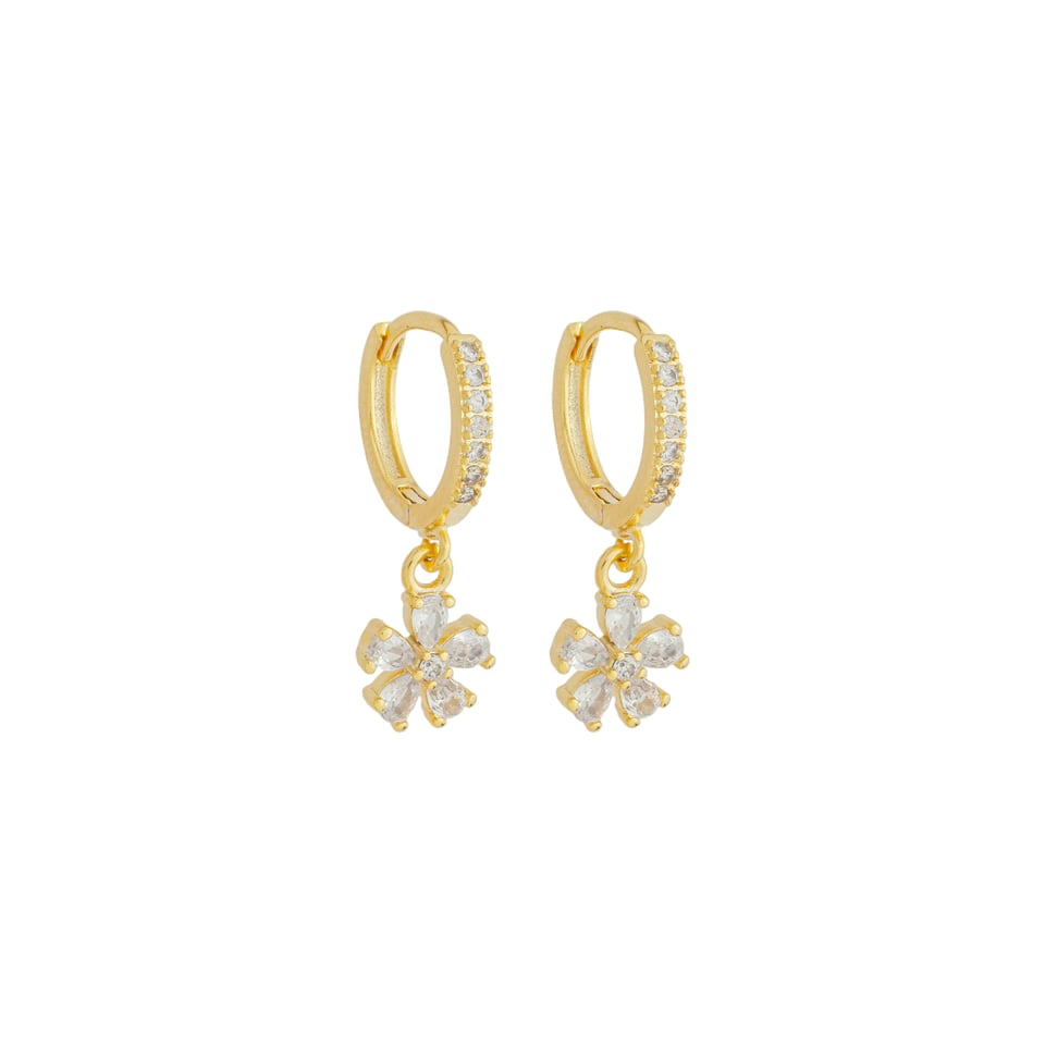 Brinco argola click com pingente flor pedra zircônia, medindo 2,2cm de comprimento BANHO DE OURO