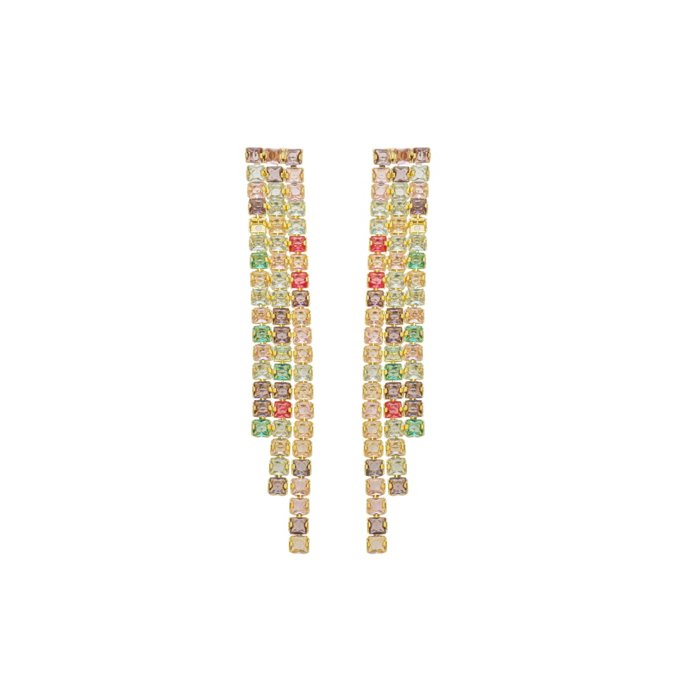 Brinco franja com pedras 2mm strass colorido, medindo 9,0x2,2cm BANHO DE RÓDIO