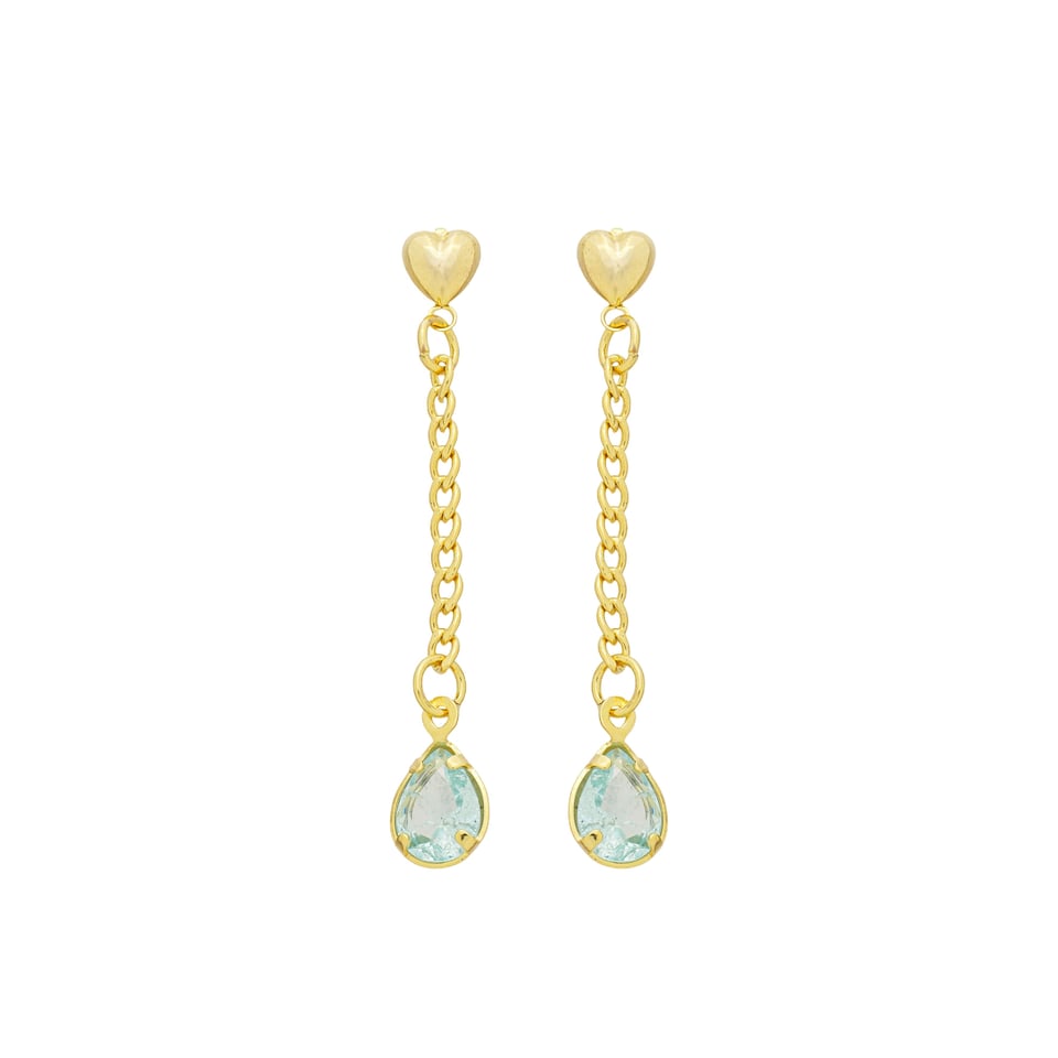 Brinco base coração com corrente grumê 2,5mm e pedra 8x6mm gota zircônia fusion azul, medindo 4,5cm de comprimento BANHO DE OURO