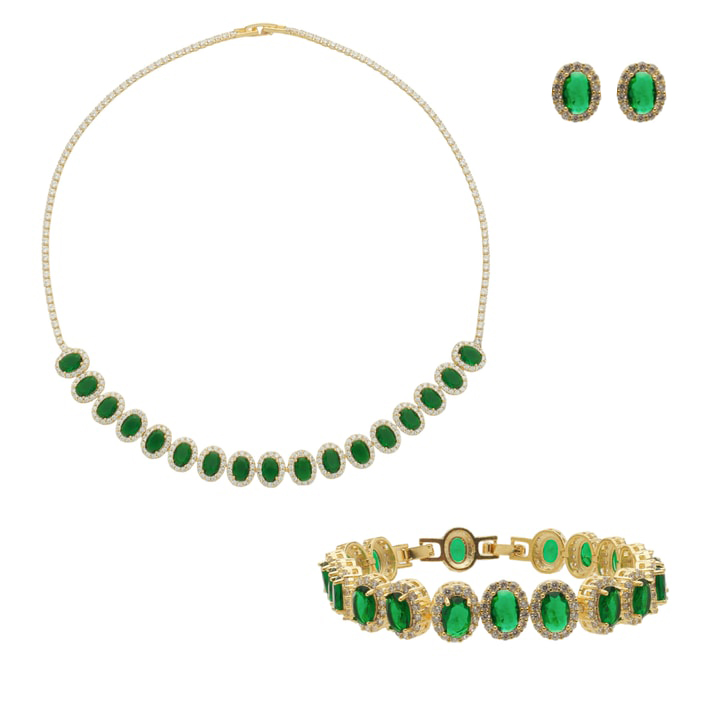 Conjunto brinco pedra 7x5mm oval zircônia verde esmeralda e em volta pedras 1mm zircônia medindo 1,0x0,8cm, corrente com pedras igual ao brinco e pedra 2mm zircônia, comprimento de 40cm e pulseira igual com comprimento de 17cm + extensor de 2cm BANHO DE OURO