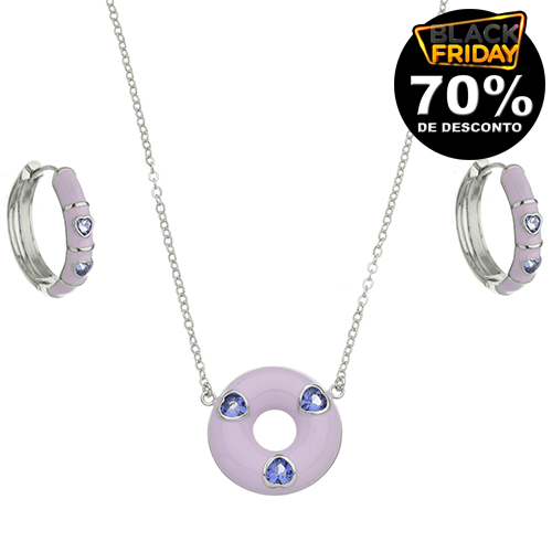 Conjunto brinco argola click resinado lilás, medindo 2,4cm de diâmetro com coração zircônia 3,0mm, corrente malha cadeado 0,90mm com pingente redondo 2,5 cm de diâmetro, comprimento 45cm + 5,0cm de extensor BANHO DE RÓDIO