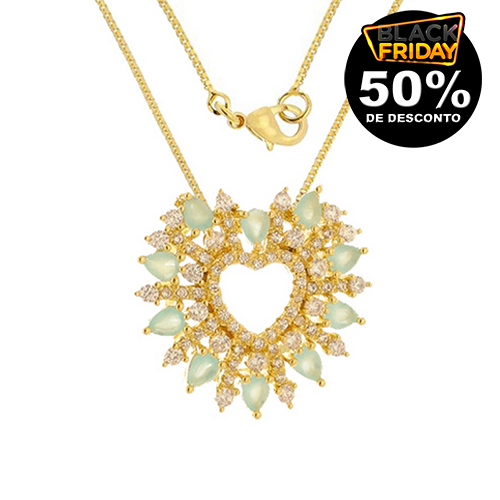 Corrente malha veneziana 0,80mm com pingente coração cravejado de pedras 1mm, 2mm zircônia e pedras 4x3mm formato gota natural, comprimento 45cm BANHO DE OURO