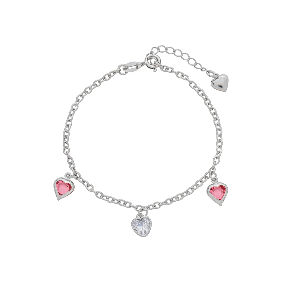 Pulseira cadeado 2,5mm com pingente coração pedra 6x6mm zircônia branca e pink, comprimento de 16cm + 3cm de extensor BANHO DE RÓDIO