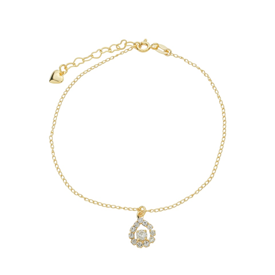 Tornozeleira malha elos iguais 1,5mm com pingente gota pedras strass, comprimento de 23cm + 3cm de extensor BANHO DE OURO