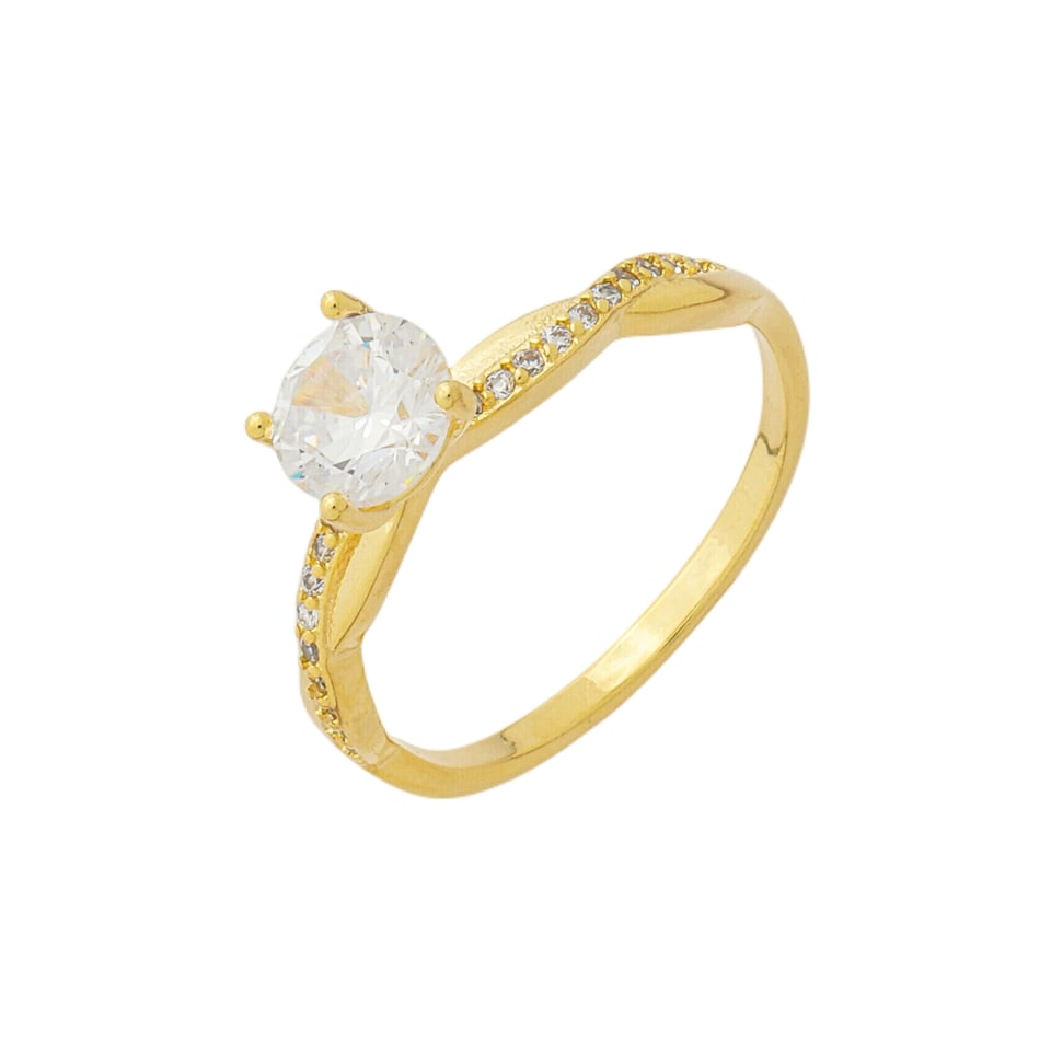 Anel solitário pedra 6mm zircônia e em volta entrelaçado liso e pedras 1mm zircônia BANHO DE OURO