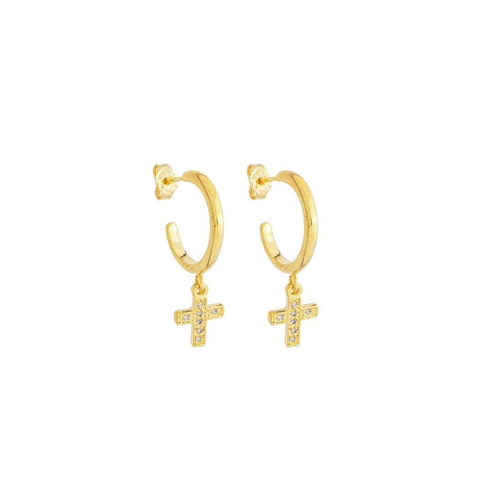 Brinco argola tubo 2mm liso com pingente cruz pedra zircônia, medindo 3cm de comprimento BANHO DE OURO