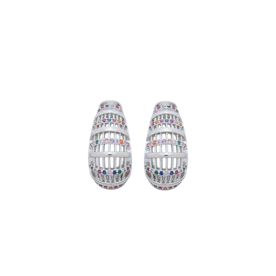 Brinco argola formato J com pedras 1mm zircônia colorida, medindo 2,2cm de comprimento BANHO DE RÓDIO