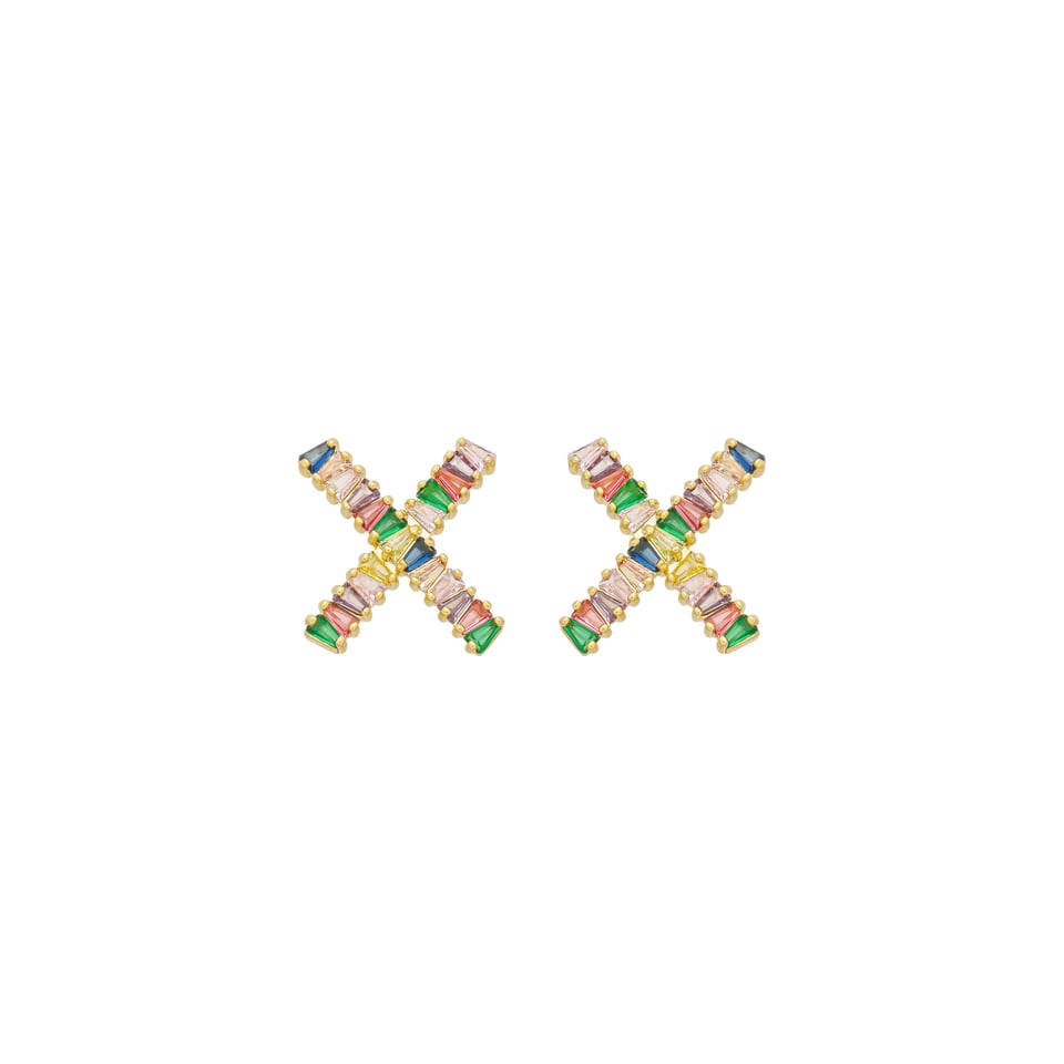 Brinco formato X com pedras baguete zircônia colorida, medindo 2x1,7cm BANHO DE OURO