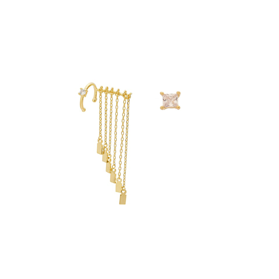 Brinco piercing de pressão com franjas medindo 7cm e brinco solitário pedra carrê 4x4mm zircônia BANHO DE OURO