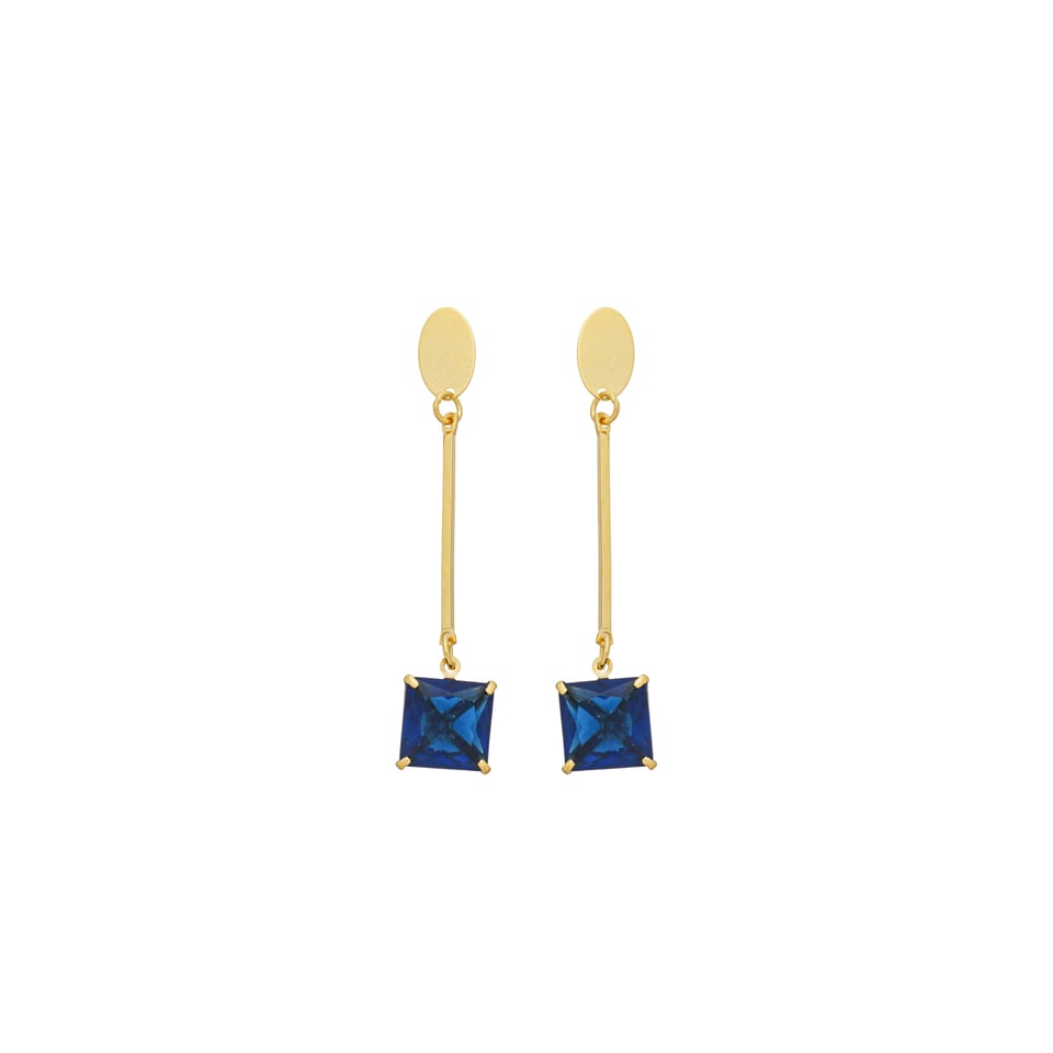 Brinco pêndulo palito liso e pedra carrê 10x10mm zircônia azul safira, medindo 6cm de comprimento BANHO DE OURO