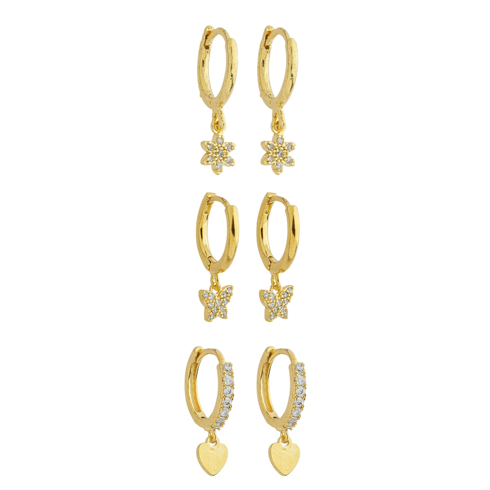 Brinco trio argola click pingente - 1 par de brinco argola click pedra 1,50mm zircônia com pingente, coração chapa lisa, medindo 1,8cm de comprimento - 1 par de brinco argola click lisa com pingente flor pedra 1,0mm zircônia, medindo 1,8cm de comprimento – 1 par de brinco argola click lisa com pingente borboleta pedras 1,0mm zircônia, medindo 1,8cm de comprimento BANHO DE OURO