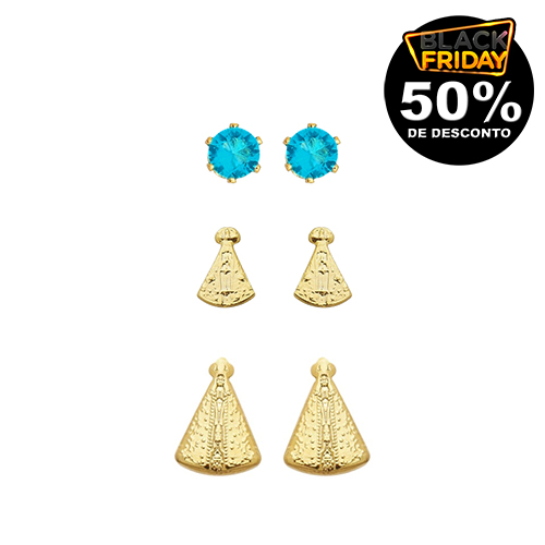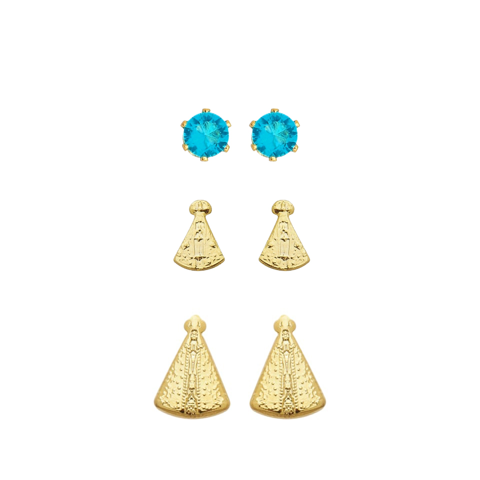 Brinco trio contendo; 1 par brinco solitário pedra 5,00mm azul; 1 par brinco Nossa Senhora chapa medindo 1,0x0,7mm; 1 par brinco Nossa Senhora 0,7x0,5mm BANHO DE OURO