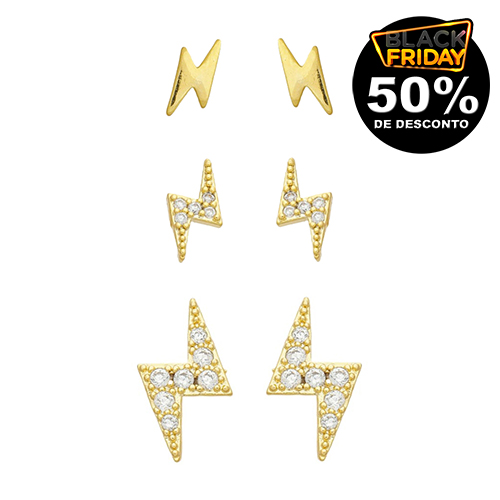 Brinco trio raio;- brinco raio com pedras 1,25mm zircônia medindo 1,2x0,6mm; - brinco raio com pedras 1,00mm zircônia medindo 0,9x0,4mm; - brinco raio chapa lisa medindo 0,5x0,3mm BANHO DE OURO