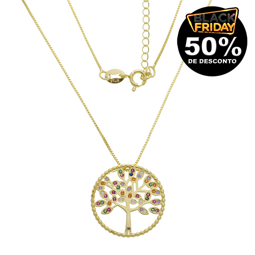 Corrente veneziana 0,9mm com pingente diâmetro de 2,3cm com árvore da vida cravejada pedra 1mm zircônia colorida, comprimento de 40cm + 5cm de extensor BANHO DE OURO